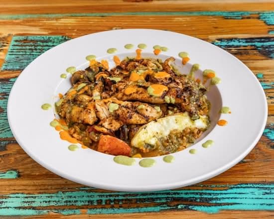 Grilled chicken tenderloin, rice, vegetables, chimi, panela cheese, tomatillo salsa, and guajillo chimi